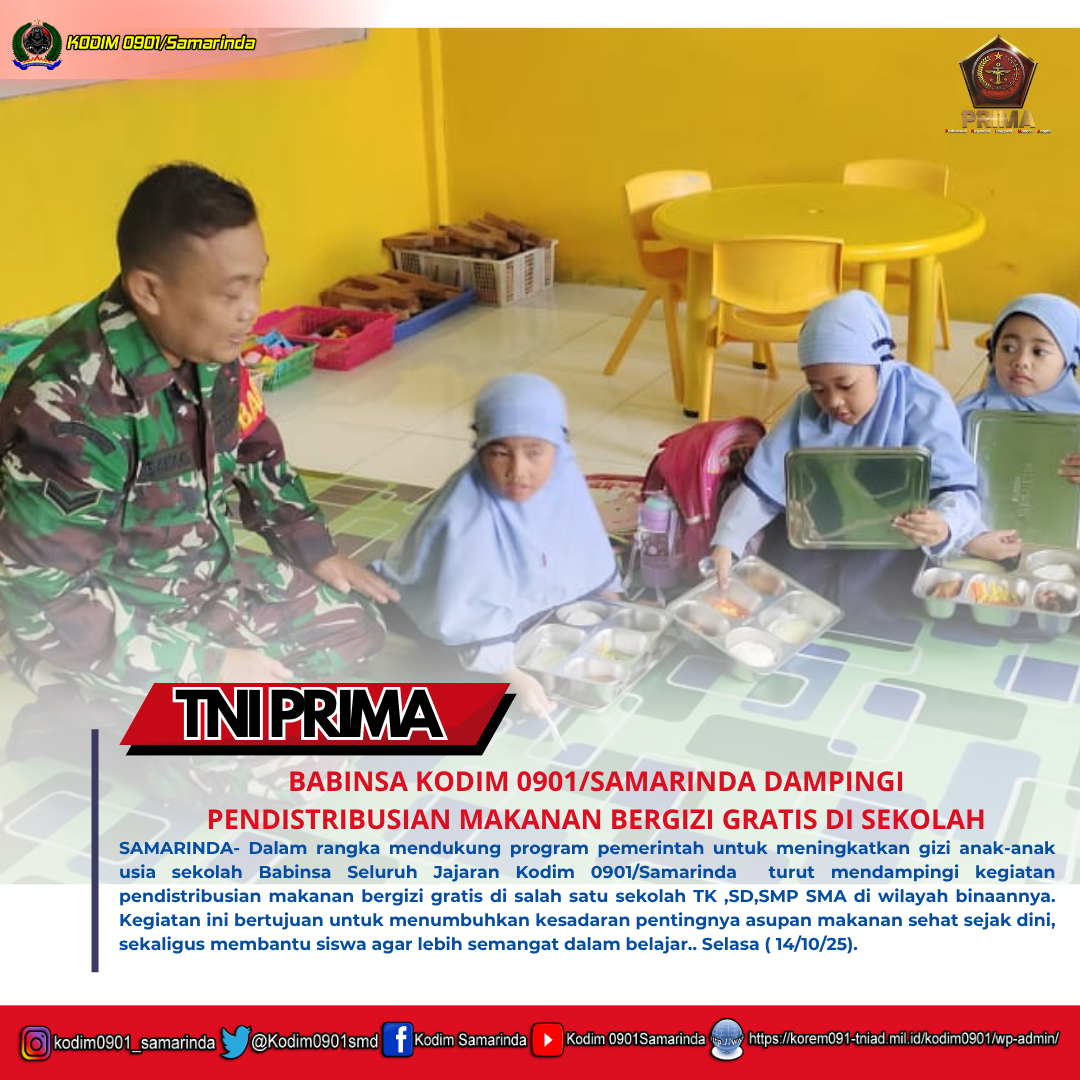SAMARINDA- Dalam rangka mendukung program pemerintah untuk meningkatkan gizi anak-anak usia sekolah Babinsa Seluruh Jajaran Kodim 0901/Samarinda turut mendampingi kegiatan pendistribusian makanan bergizi gratis di salah satu sekolah TK ,SD,SMP SMA di wilayah binaannya. Kegiatan ini bertujuan untuk menumbuhkan kesadaran pentingnya asupan makanan sehat sejak dini, sekaligus membantu siswa agar lebih semangat dalam belajar.. Selasa ( 14/10/25).