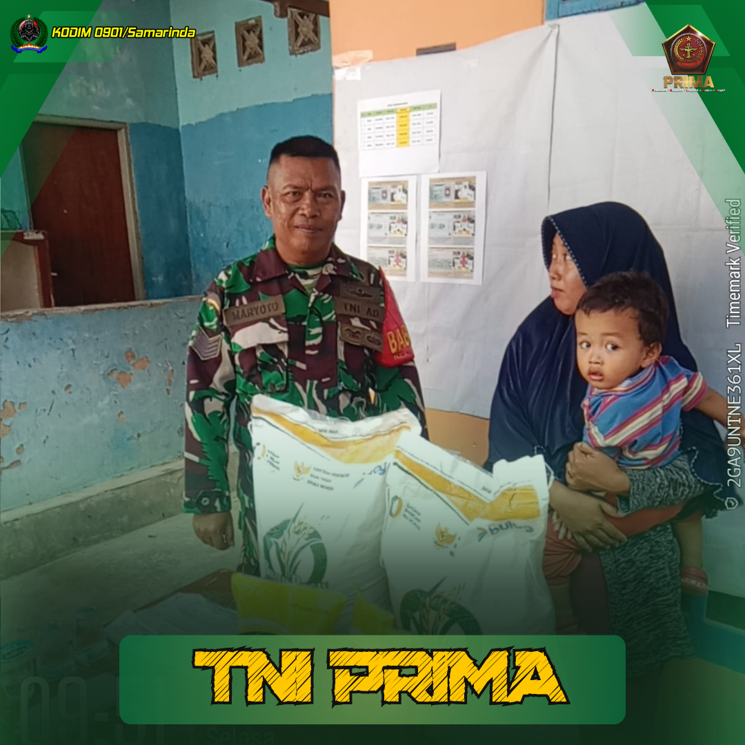 Kehadiran Serma Maryoto selaku Babinsa setempat yaitu memonitoring sekaligus memastikan penyaluran bantuan sosial (bansos) berupa beras Bulog keluarga penerima manfaat berjalan dengan tertib dan sesuai sasaran.