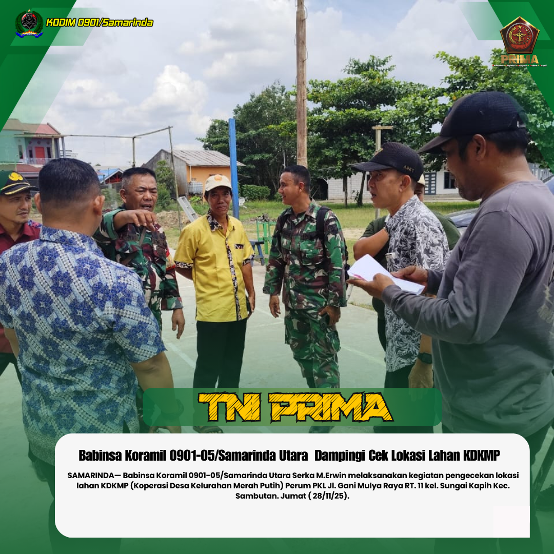 SAMARINDA— Babinsa Koramil 0901-05/Samarinda Utara Serka M.Erwin melaksanakan kegiatan pengecekan lokasi lahan KDKMP (Koperasi Desa Kelurahan Merah Putih) Perum PKL Jl. Gani Mulya Raya RT. 11 kel. Sungai Kapih Kec. Sambutan. Jumat ( 28/11/25).