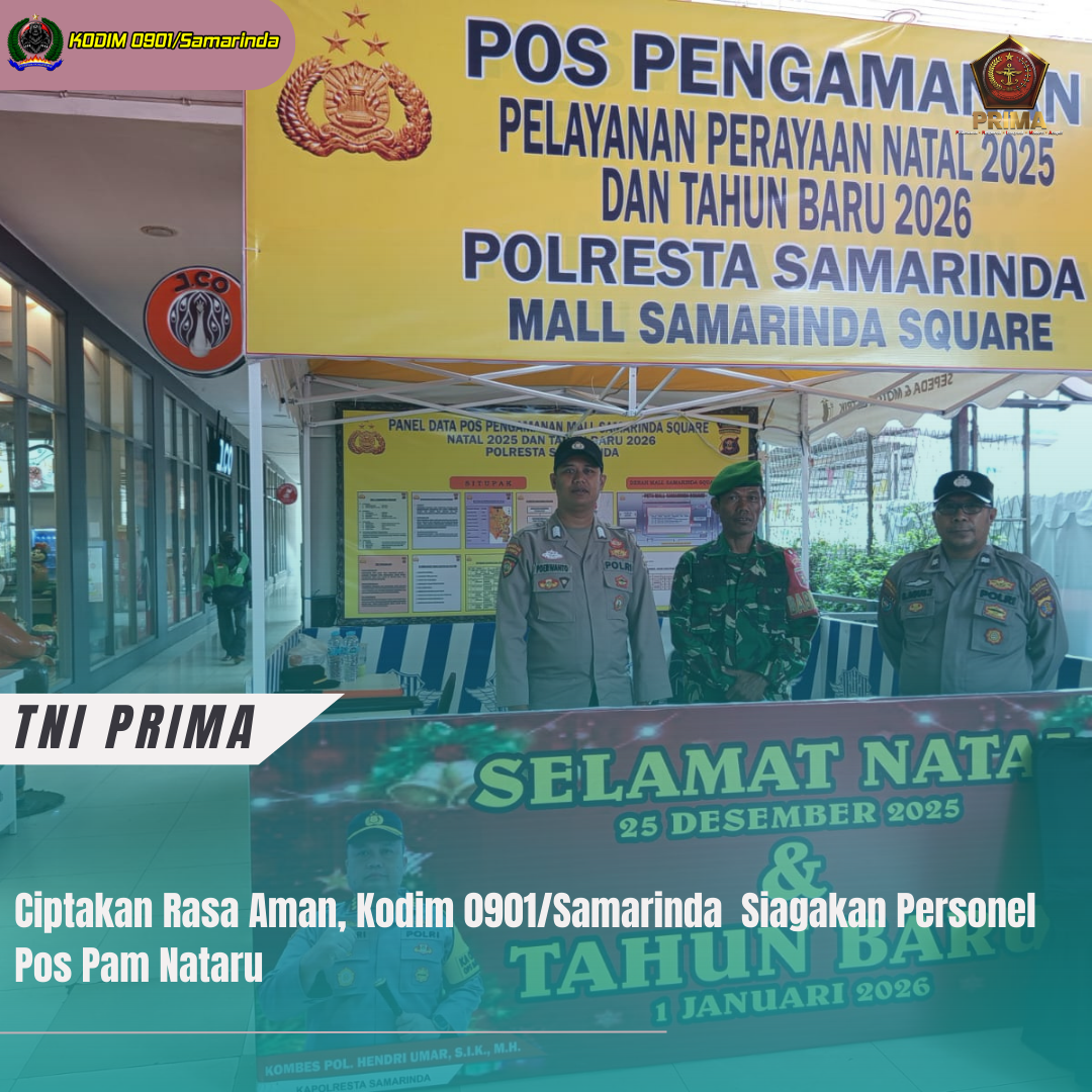 SAMARINDA-  Dalam rangka menciptakan rasa aman dan nyaman saat perayaan Natal dan Tahun Baru anggota personel Kodim 0901/Samarinda  bersama anggota POLRI dan Instansi lainya melaksanakan Siaga Pengamanan Perayaan Hari Raya Natal dan jelang Tahun Baru 2026.