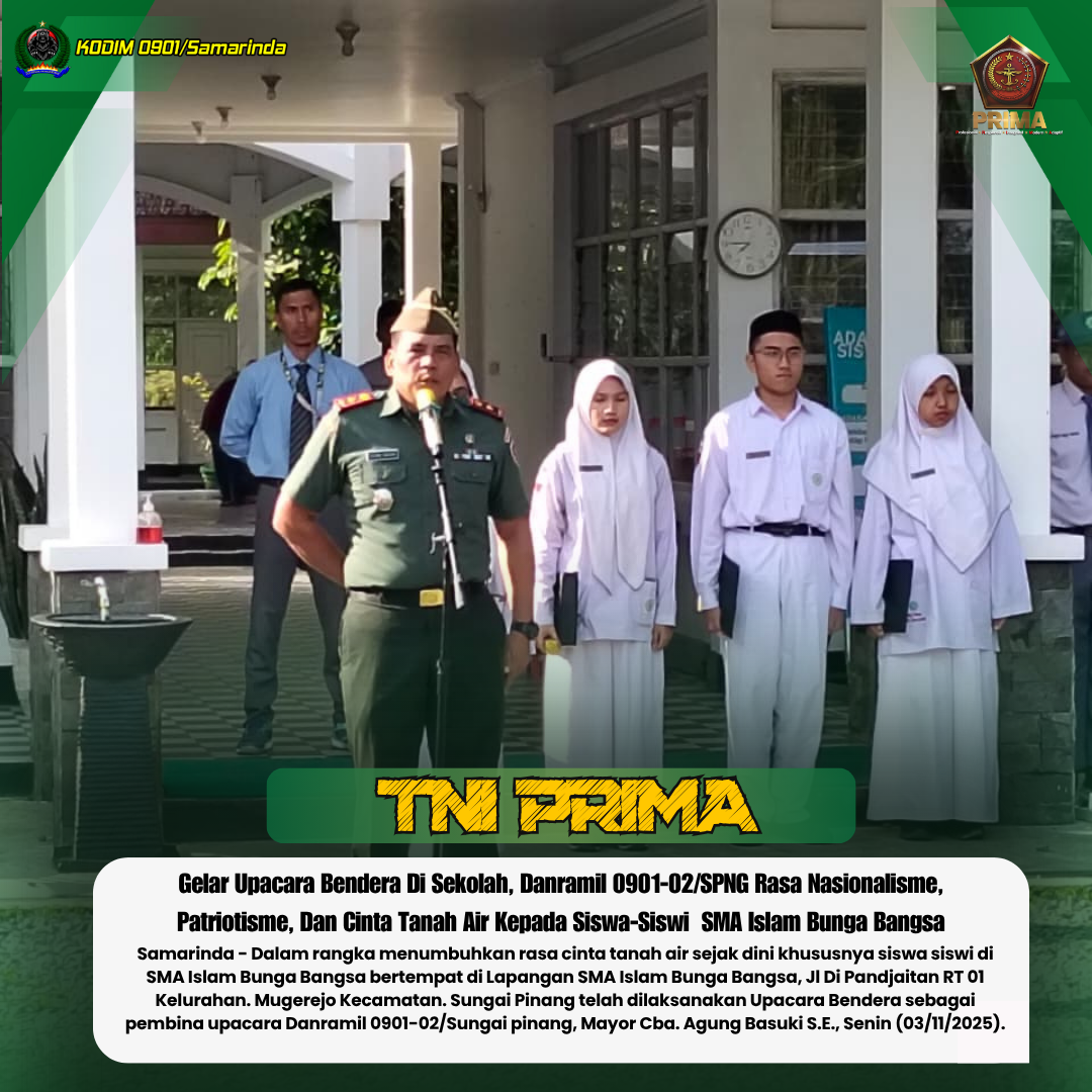 Samarinda – Dalam rangka menumbuhkan rasa cinta tanah air sejak dini khususnya siswa siswi di SMA Islam Bunga Bangsa bertempat di Lapangan SMA Islam Bunga Bangsa, Jl Di Pandjaitan RT 01 Kelurahan. Mugerejo Kecamatan. Sungai Pinang telah dilaksanakan Upacara Bendera sebagai pembina upacara Danramil 0901-02/Sungai pinang, Mayor Cba. Agung Basuki S.E., Senin (03/11/2025).