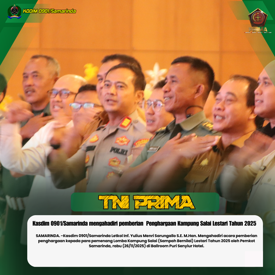 SAMARINDA. -Kasdim 0901/Samarinda Letkol Inf. Yulius Menri Sarungallo S.E. M.Han. Mengahadiri acara pemberian penghargaan kepada para pemenang Lomba Kampung Salai (Sampah Bernilai) Lestari Tahun 2025 oleh Pemkot Samarinda, rabu (26/11/2025) di Ballroom Puri Senyiur Hotel.