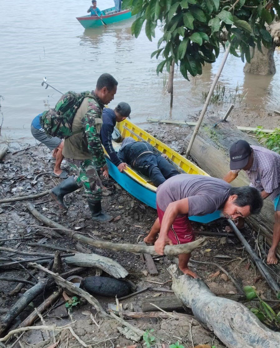PENDIM 0902/BRU – Bintara Pembina Desa (Babinsa) Koramil 05/Sambaliung Kodim 0902/Berau, Pelda Yoktan Edison, bersama aparat kampung dan warga kampung Sukan Tengah dalam pencarian korban tenggelam berhasil menemukan korban 1 orang dewasa, di Tepi Sungai Sungai (Pulau Besing) Kampung Sukan Tengah, Kecamatan Sambaliung, Kabupaten Berau. Senin (12/1/2026).