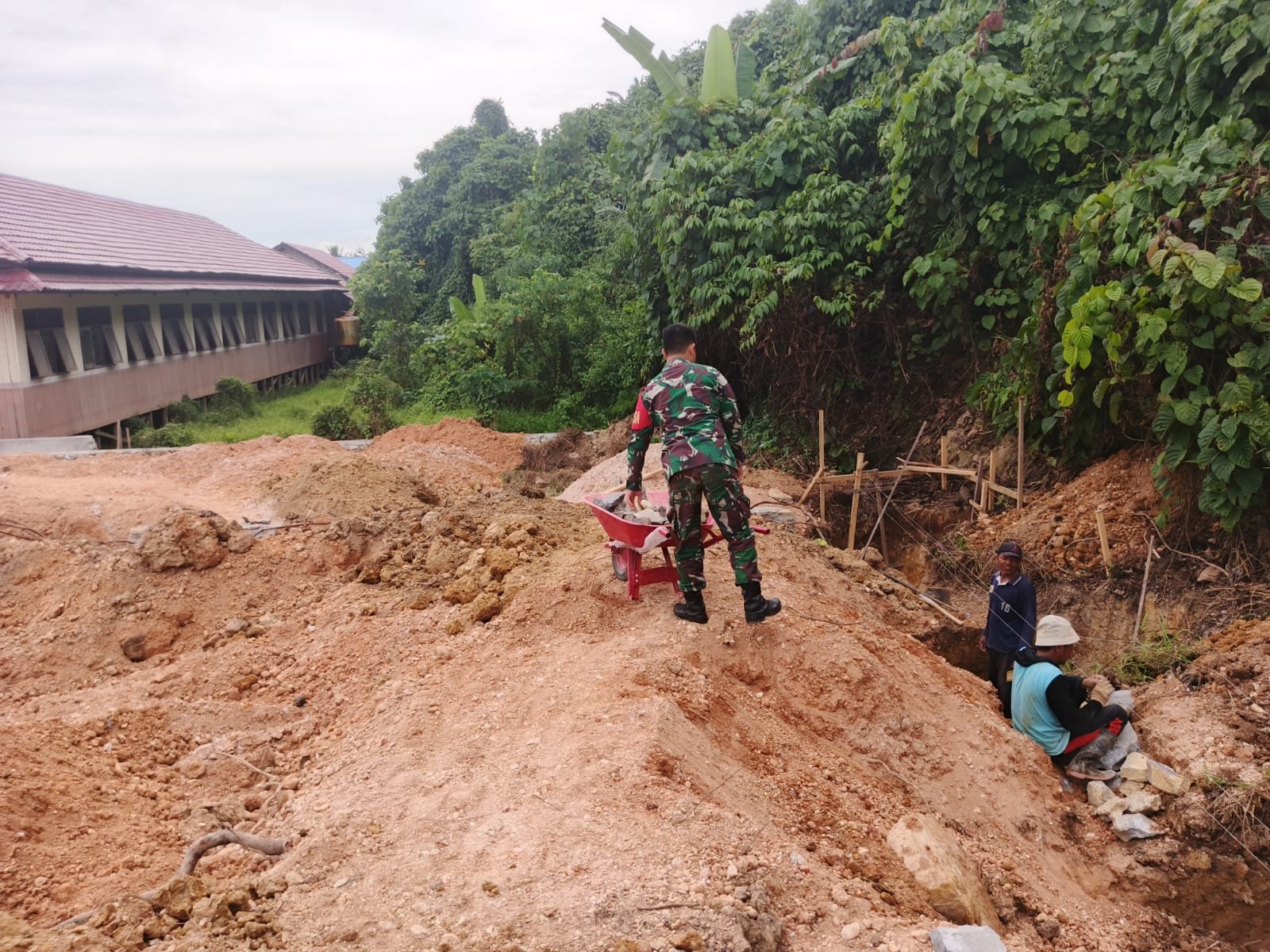 PENDIM 0902/BRU – Bintara Pembina Desa (Babinsa) Koramil 05/Sambaliung Kodim 0902/Berau, Praka Yafet Simson, S.A.P., melaksanakan kegiatan pengawasan pemasangan pondasi batu belah dan pengecoran lantai kerja bawah pondasi footplat di lahan KDKMP yang berlokasi di Kampung Long Lanuk, Kecamatan Sambaliung, Kabupaten Berau. Jumat (9/1/2026).