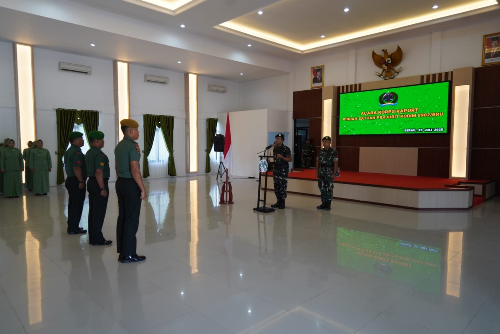 PENDIM 0902/BRU – Dalam suasana khidmat dan penuh kekeluargaan, Kodim 0902/Berau menggelar acara pelepasan Perwira dan Anggota pindah satuan, pada Rabu (23/7/2025).
