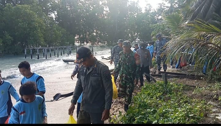 Di Biduk-Biduk, TNI berkolaborasi dengan pihak Kepolisian dan instansi terkait lainnya melakukan pembersihan Pantai Harapan, Selain aparat, sejumlah siswa berseragam sekolah turut terlibat dalam kegiatan tersebut.