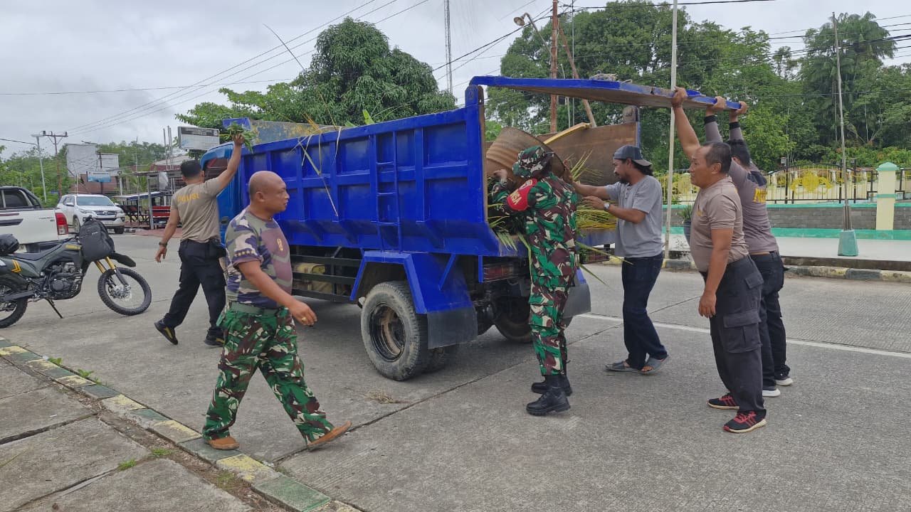 Personel TNI-Polri tampak bergotong royong membersihkan sampah di lingkungan sekitar, kemudian mengangkut sampah dengan menggunakan truk menuju tempat pembuangan akhir.
