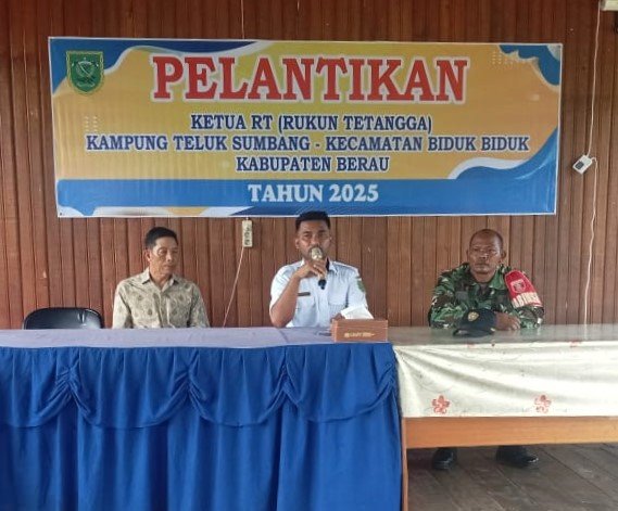 PENDIM 0902/BRU – Dalam rangka monitoring wilayah Binaan, Babinsa Kampung Teluk Sumbang, Koramil 11/Biduk-Biduk, Kodim 0902/Berau, Serda Fauzan, menghadiri Pelantikan Ketua RT (Rukun Tetangga) terpilih periode Tahun 2025 – 2030. Pelantikan digelar di Balai Kesenian Kampung Teluk Sumbang, Kecamatan Biduk-Biduk, Kabupaten Berau. Jumat (22/8/2025).
