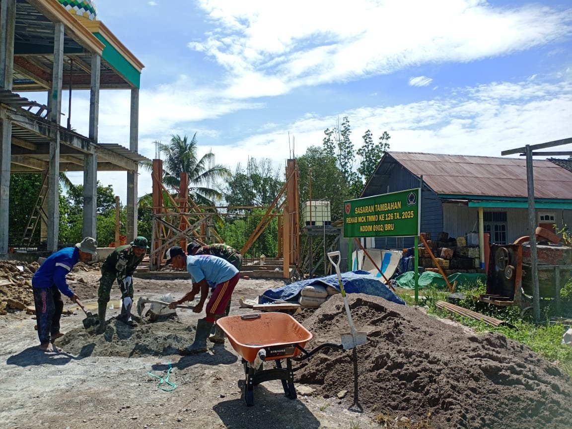 PENDIM 0902/BRU – Kekompakkan antara Satgas TNI Manunggal Membangun Desa (TMMD) Reguler 126 Kodim 0902/Berau dengan warga Kampung, tidak diragukan lagi. Tak hanya dalam hal besar, dalam membuat adukan semen untuk Mandi Cuci Kakus (MCK) di Masjid Al Ansor Nurul Yasin, Kampung Labanan Makmur, Kecamatan Teluk Bayur, mereka tetap kompak. Kamis (9/10/2025).