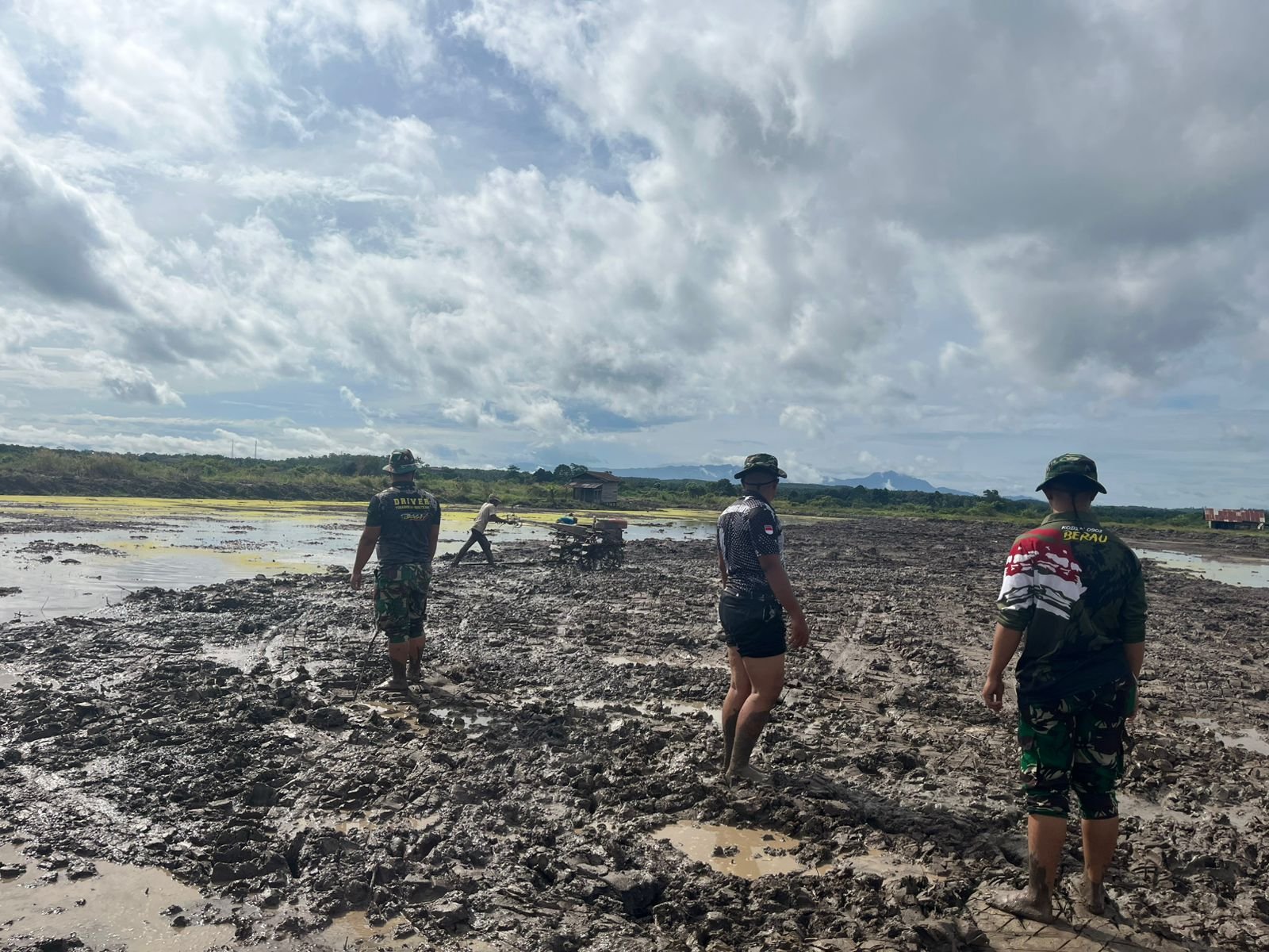 PENDIM 0902/BRU – Komitmen TNI dalam mendukung ketahanan pangan di wilayah Kabupaten Berau kembali diwujudkan oleh Satgas TNI Manunggal Membangun Desa (TMMD) ke-126 Kodim 0902/Berau. para prajurit turun langsung ke sawah bersama warga Kampung Labanan Makmur, untuk membajak lahan yang akan ditanami padi.