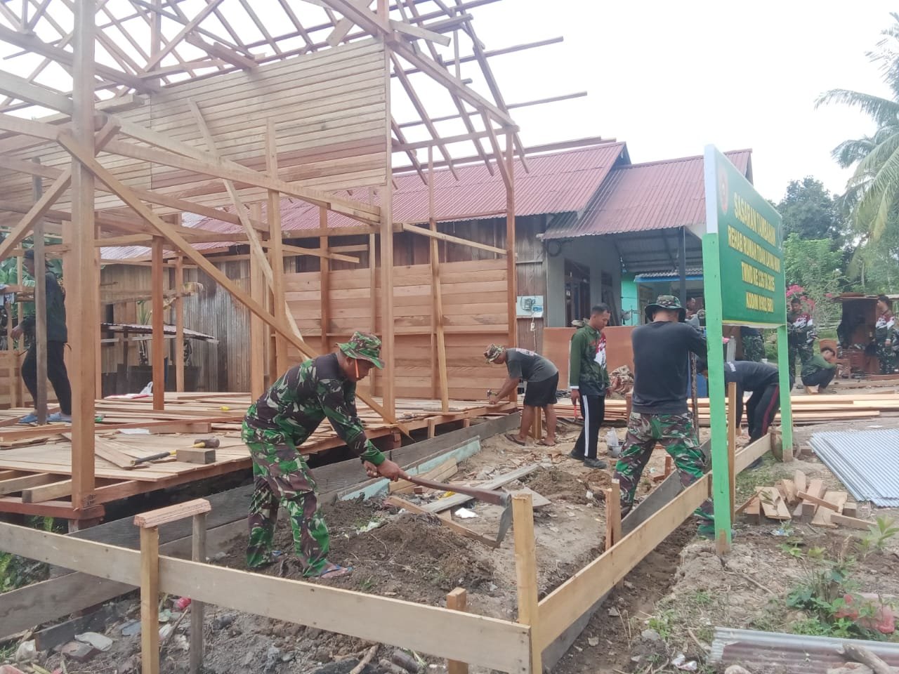 PENDIM 0902/BRU – Satgas TNI Manunggal Membangun Desa (TMMD) Reguler Ke-126 Tahun 2025 Kodim 0902/Berau kali ini terus mengerjakan sasaran fisik merehab Rumah Tidak Layak Huni (RTLH), milik warga Kampung Labanan Makmur, Kecamatan Teluk Bayur, Kab.Berau, Rabu  (15/10/2025).