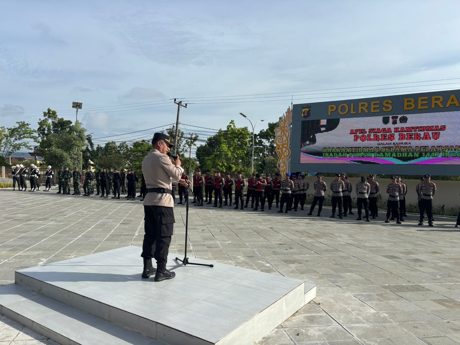 PENDIM 0902/BRU – Dalam rangka menjamin kekhusyukan umat Muslim menjalankan ibadah puasa, jajaran Polres Berau bersama Kodim 0902/Bru dan instansi terkait menggelar Apel Gelar Pasukan Siaga Kamtibmas Selama Ibadah Puasa Bulan Ramadhan 1447 H/2026 M. Kegiatan dipusatkan di Lapangan Mapolres Berau, Jalan Gatot Subroto, Kelurahan Sei Bedungun, pada Rabu (25/02/2026).