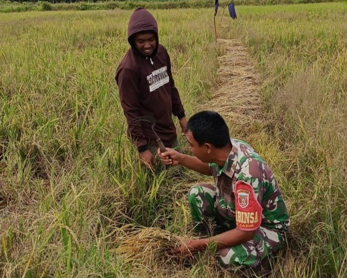 Sukseskan Ketahanan Pangan, Babinsa Kampung Tasuk Koramil 0902-02/Gunta Bantu Petani Panen Padi