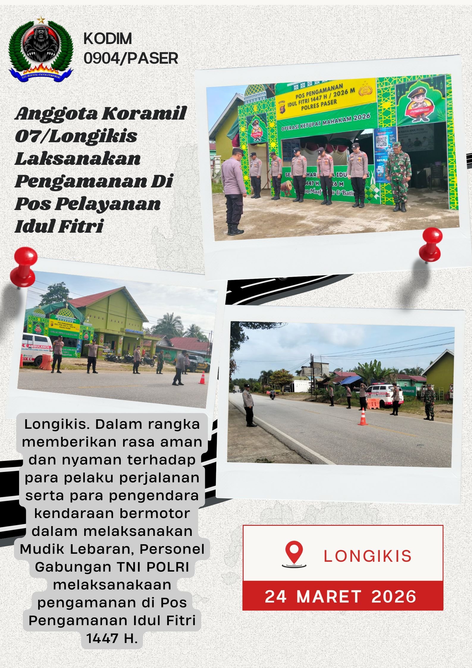 Kodim 0904/Paser, Longikis. Dalam rangka memberikan rasa aman dan nyaman terhadap para pelaku perjalanan serta para pengendara kendaraan bermotor dalam melaksanakan Mudik Lebaran, Personel Gabungan TNI POLRI  melaksanakaan pengamanan di Pos Pengamanan Idul Fitri 1447 H. Selasa (24/3/2026)