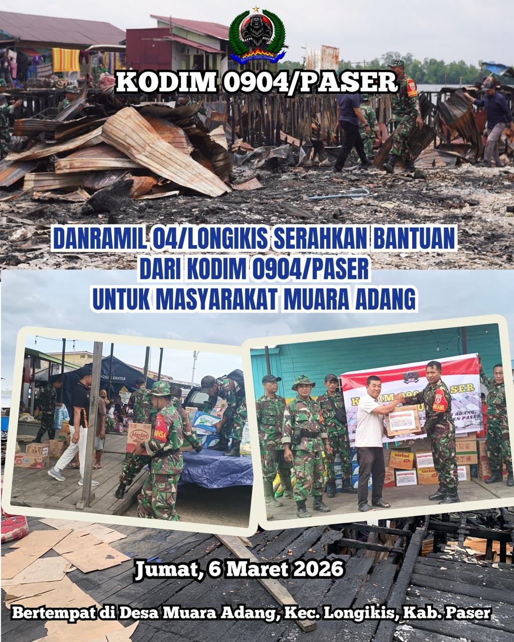 Kodim 0904/Paser, Longikis. Bertempat di Posko Bencana Kebakaran Desa Muara Adang Kecamatan Longikis Kabupaten Paser, Kapten Inf A. Agung Danramil 0904-04/Longikis serahkan bantuan Sosial dari Kodim 0904/Paser kepada warga Desa Muara Adang yang terdampak Bencana Kebakaran. Jumat (6/3/2026)