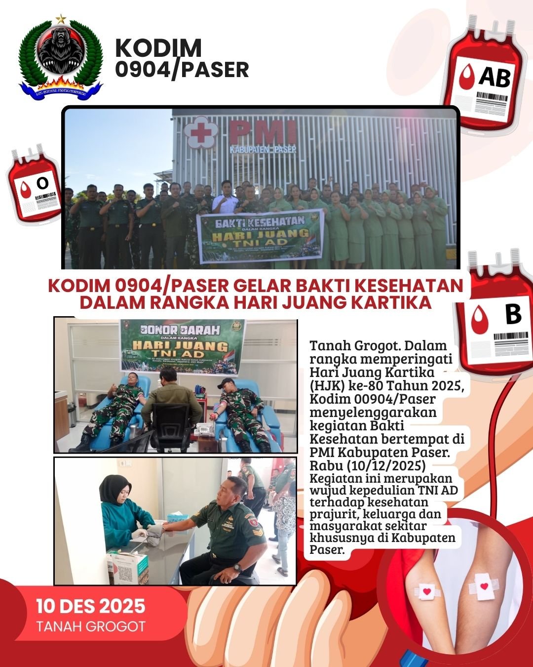 Kodim 0904/Paser Korem 091/ASN Kodam VI/Mlw, Tanah Grogot. Dalam rangka memperingati Hari Juang Kartika (HJK) ke-80 Tahun 2025, Kodim 00904/Paser menyelenggarakan kegiatan Bakti Kesehatan bertempat di PMI Kabupaten Paser. Rabu (10/12/2025)