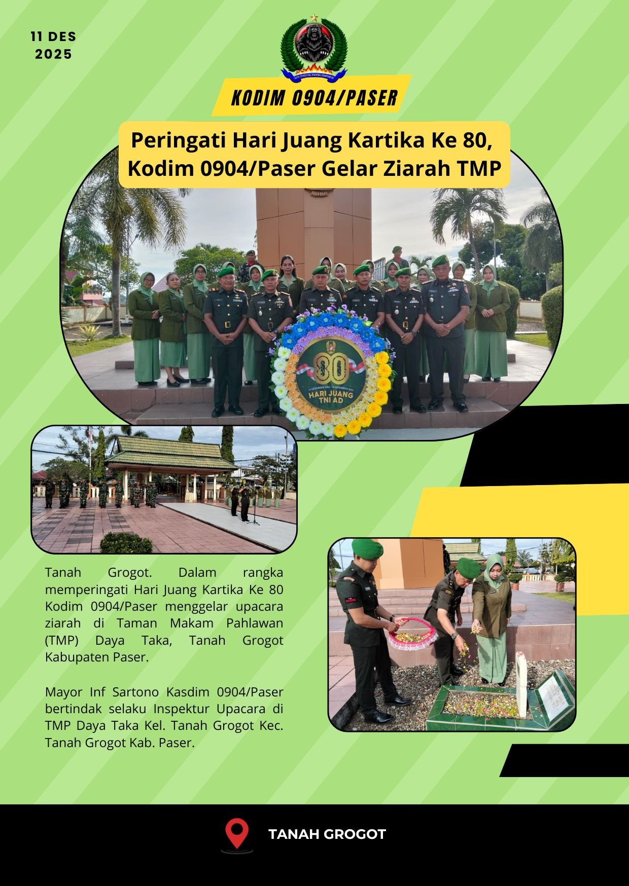 Kodim 0904/Paser Korem 091/ASN Kodam VI/Mlw, Tanah Grogot. Dalam rangka memperingati Hari Juang Kartika Ke 80 Kodim 0904/Paser menggelar upacara ziarah di Taman Makam Pahlawan (TMP) Daya Taka, Tanah Grogot Kabupaten Paser. Kamis (11/12/2025).