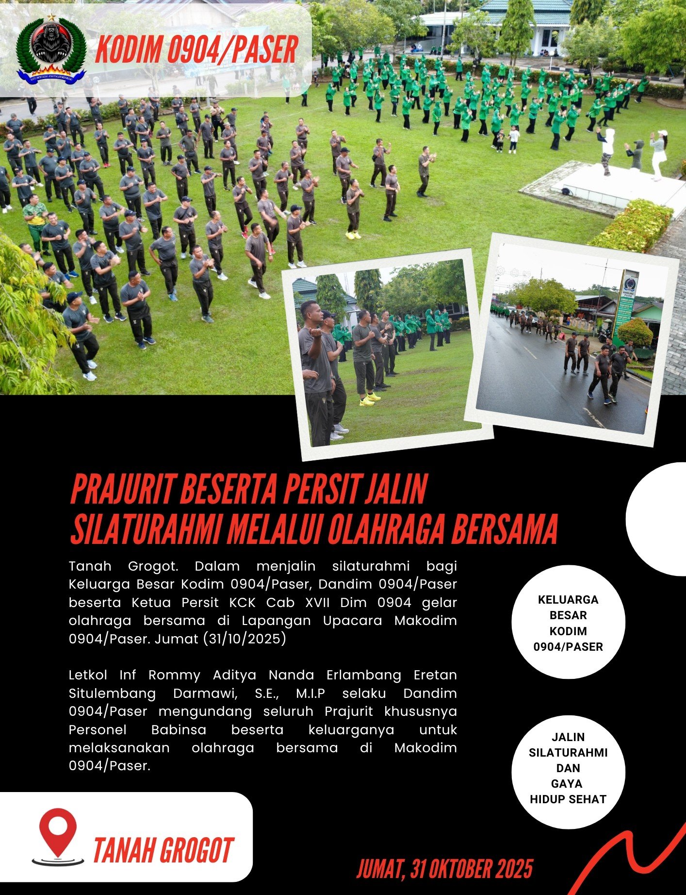 Kodim 0904/Paser Korem 091/ASN Kodam VI/Mlw, Tanah Grogot. Dalam menjalin silaturahmi bagi Keluarga Besar Kodim 0904/Paser, Dandim 0904/Paser beserta Ketua Persit KCK Cab XVII Dim 0904 gelar olahraga bersama di Lapangan Upacara Makodim 0904/Paser. Jumat (31/10/2025)