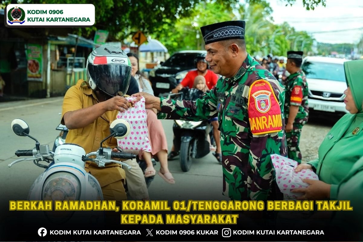 Kutai Kartanegara, korem091tniad–  Sebagai wujud kepedulian sosial dan solidaritas sesama umat muslim di bulan suci Ramadhan 1447 H, jajaran Koramil 0906-01/Tenggarong menggelar kegiatan berbagi takjil kepada masyarakat, bertempat di depan Makoramil 0906-01/Tenggarong Jalan Danau Aji Kelurahan Melayu Kecamatan Tenggarong Kabupaten Kutai Kartanegara.