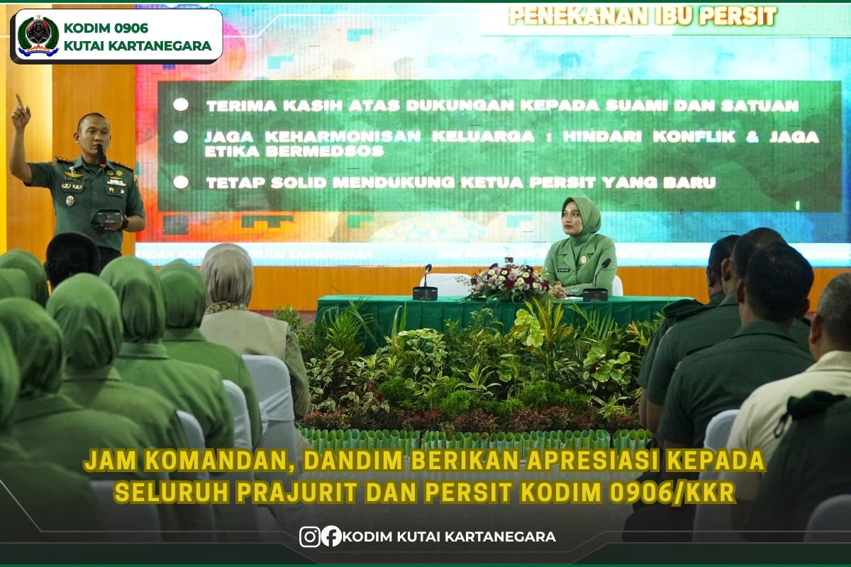 Melalui kegiatan Jam Komandan (Jamdan) yang diberlangsung di Aula Darmawangsa Makodim 0906/Kkr (kamis, 4/12/25), Letkol Czi Damai Adi Setiawan juga menyampaikan bahwa keberhasilan satuan tidak terlepas dari soliditas dan kerja sama seluruh Keluarga Besar Kodim 0906/Kkr, baik prajurit, PNS maupun Persit yang selalu mendukung setiap tugas pokok dan kemajuan satuan.