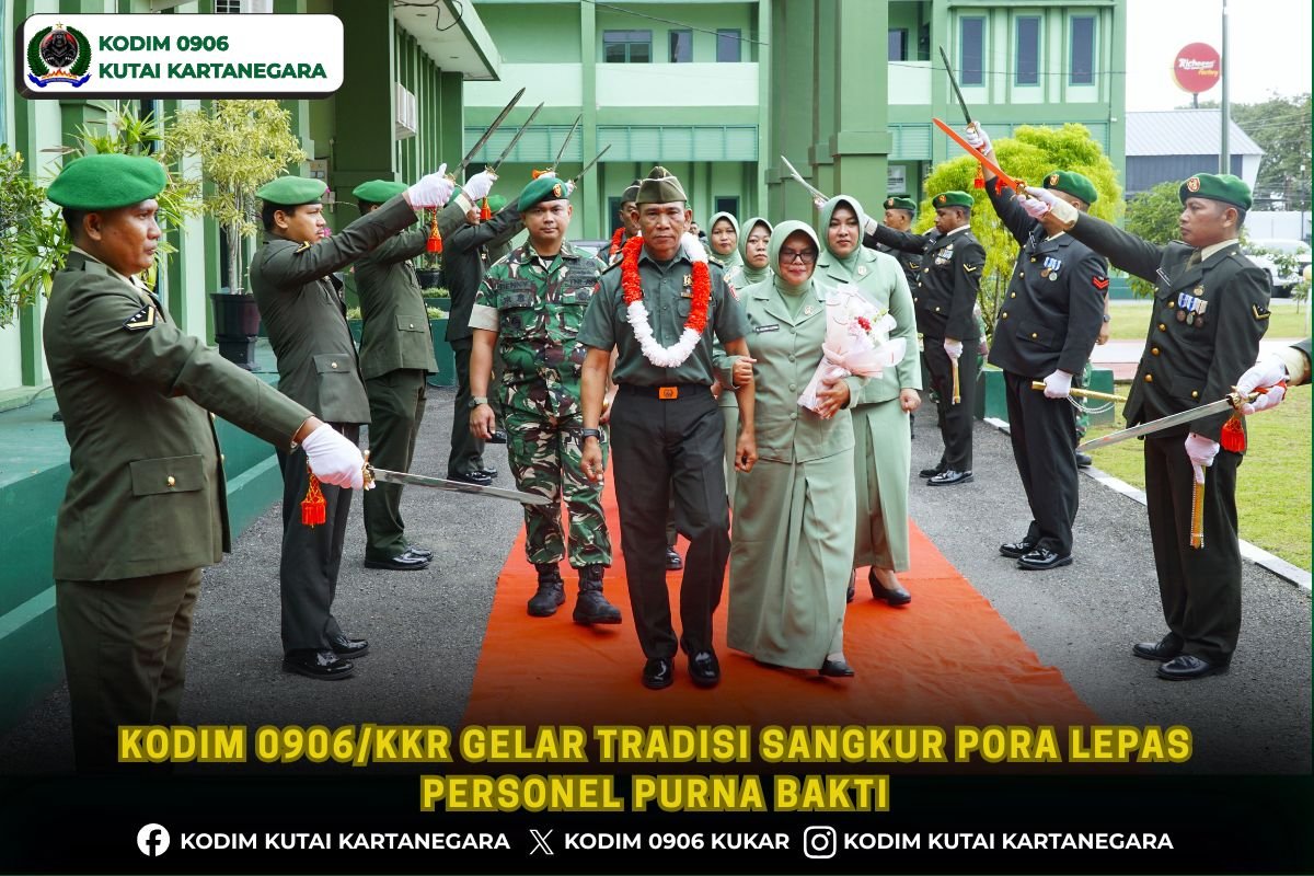 Kutai Kartanegara, korem091tniad– Dengan nuansa militer yang khas dan istimewa, Kodim 0906/Kutai Kartanegara (Kkr) menggelar tradisi Sangkur Pora dalam acara pelepasan prajurit yang telah purna bakti atau selesai melaksanakan tugas serta pengabdiannya sebagai prajurit TNI AD. Prosesi pelepasan tersebut berlangsung di halaman Makodim 0906/Kkr Jalan KH. Ahmad Mukhsin Kelurahan Timbau Kecamatan Tenggarong, Kukar. Senin (02/3/26)