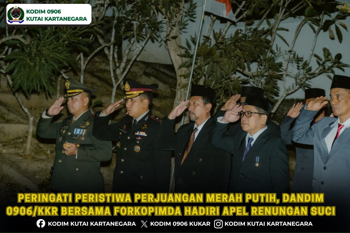 Kutai Kartanegara. korem091tniad.com– Dalam rangka memperingati Peristiwa Perjuangan Merah Putih yang ke 79 tahun Dandim 0906/Kkr Letkol Arm Benny Budiman bersama unsur Forum Koordinasi Pimpinan Daerah (Forkopimda) menghadiri apel renungan suci pada (Senin malam 26/1/26) yang bertempat di TMP Wasah Batuah di jalan Pahlawan Kelurahan Sanga Sanga Dalam kecamatan Sanga Sanga.