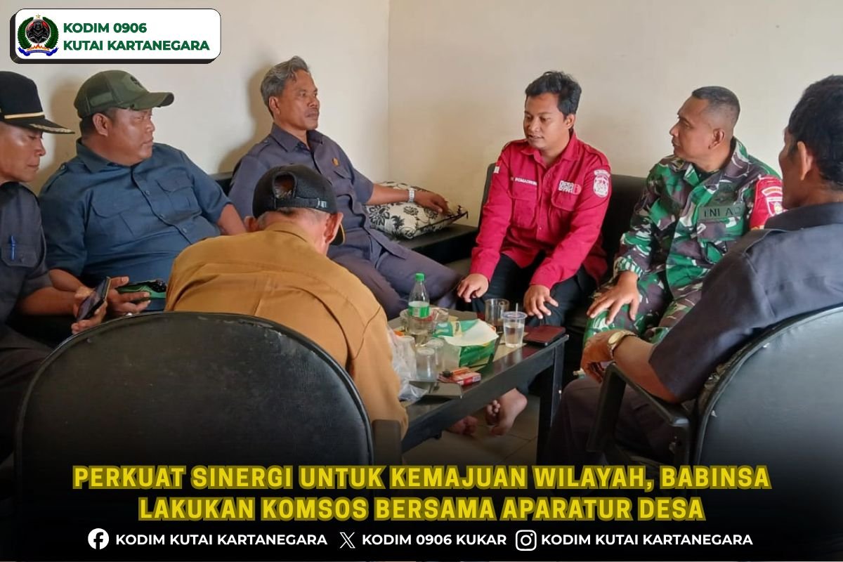 Kutai Kartanegara. korem091tniad.com – Anggota Babinsa Koramil 0906-08/Muara Kaman Serka Nurkolis melakukan komunikasi sosial (komsos) bersama aparatur desa bertempat di kantor Desa yang berada di jalan M. Yusuf Desa Desa Bukit Jering Kecamatan Muara Kaman, Kamis 8/1/26.