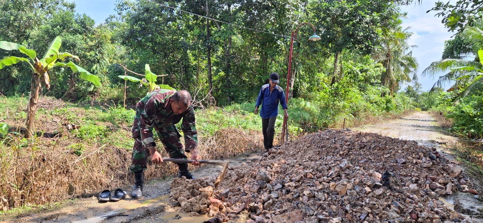 Dalam kegiatan tersebut, Babinsa Serka Samsul bersama salah satu warga setempat, Bpk. Harun, turut terjun langsung melakukan penimbunan jalan, sebagai wujud nyata semangat gotong royong dan kebersamaan.
