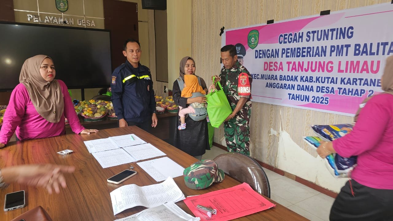 BONTANG – Dalam rangka mendukung program pemerintah dalam menurunkan angka stunting, Babinsa Koramil 0908-02/Muara Badak, Kodim 0908/Bontang, Serka Mahfud, menghadiri kegiatan pemberian makanan tambahan (PMT) kepada balita bertempat di Kantor Desa Tanjung Limau, Kecamatan Muara Badak, Kabupaten Kutai Kartanegara, Selasa (25/11/2025).