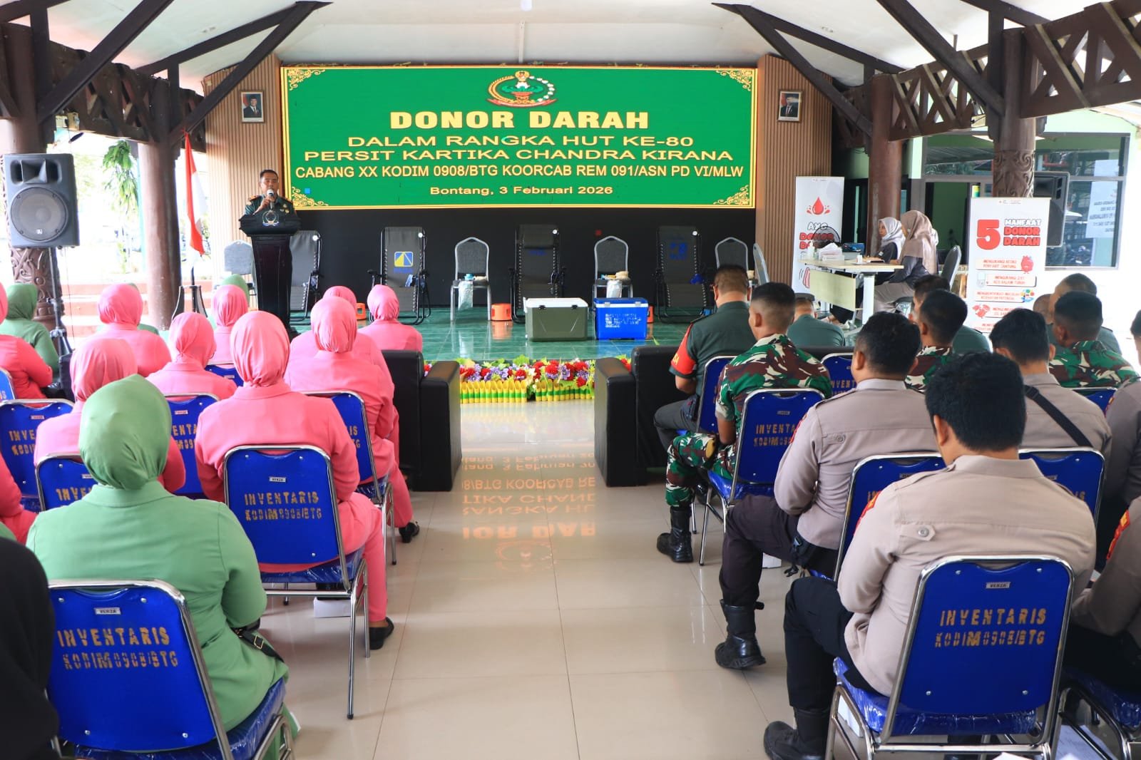 BONTANG – Dalam rangka memperingati Hari Ulang Tahun (HUT) ke-80 Persit Kartika Chandra Kirana, Persit KCK Cabang XX Kodim 0908/Bontang Koorcab Rem 091/ASN PD VI/Mulawarman menggelar kegiatan Donor Darah, bertempat di Lamin Makodim 0908/Bontang, Jalan Awang Long, Kelurahan Bontang Baru, Kecamatan Bontang Utara, Selasa (03/02/2026).