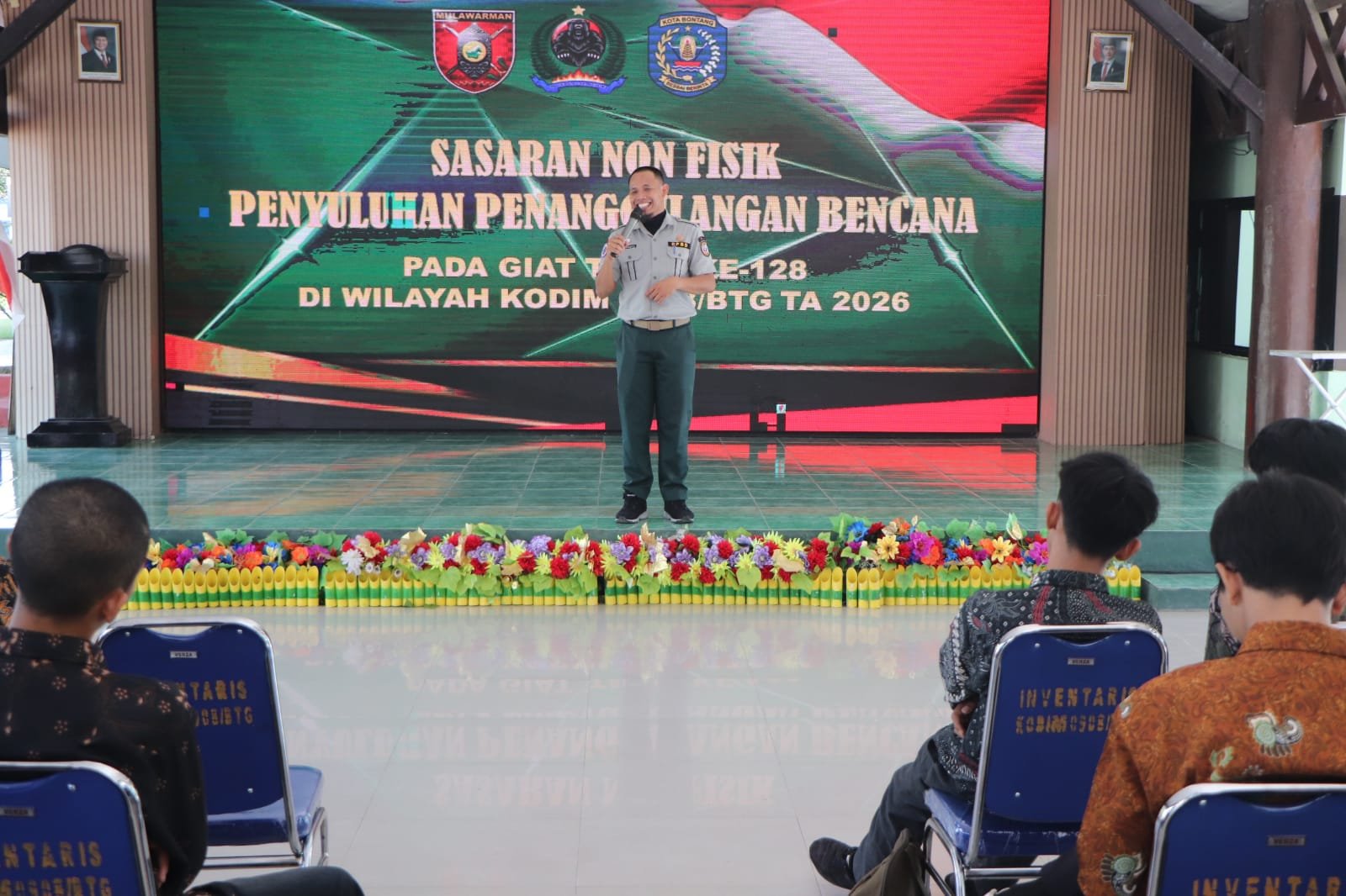 Bontang – Dalam rangka pelaksanaan TNI Manunggal Membangun Desa (TMMD) Ke-128 Tahun Anggaran 2026, Kodim 0908/Bontang melaksanakan kegiatan penyuluhan penanggulangan bencana sebagai salah satu sasaran non fisik. Kegiatan ini berlangsung di Lamin Makodim 0908/Bontang, Jl. Awang Long, Kelurahan Bontang Baru, Kecamatan Bontang Selatan, Jum’at (24/04/2026).