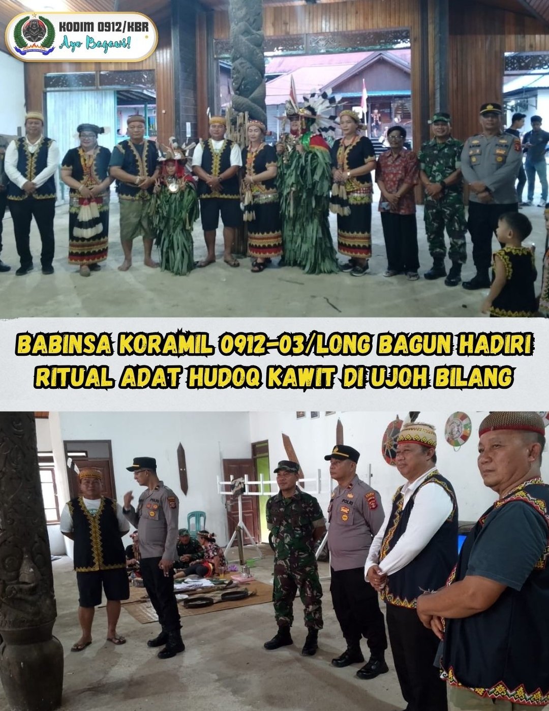 Mahakam Ulu – Babinsa Koramil 0912-03/Long Bagun Peltu Budi menghadiri kegiatan rangkaian Ritual Adat Hudoq Kawit yang berlangsung di Balai Adat Uma Tu’an, Kampung Ujoh Bilang RT 4, Kecamatan Long Bagun, Kabupaten Mahakam Ulu, pada Minggu (12/10/2025) pukul 16.00 Wita.