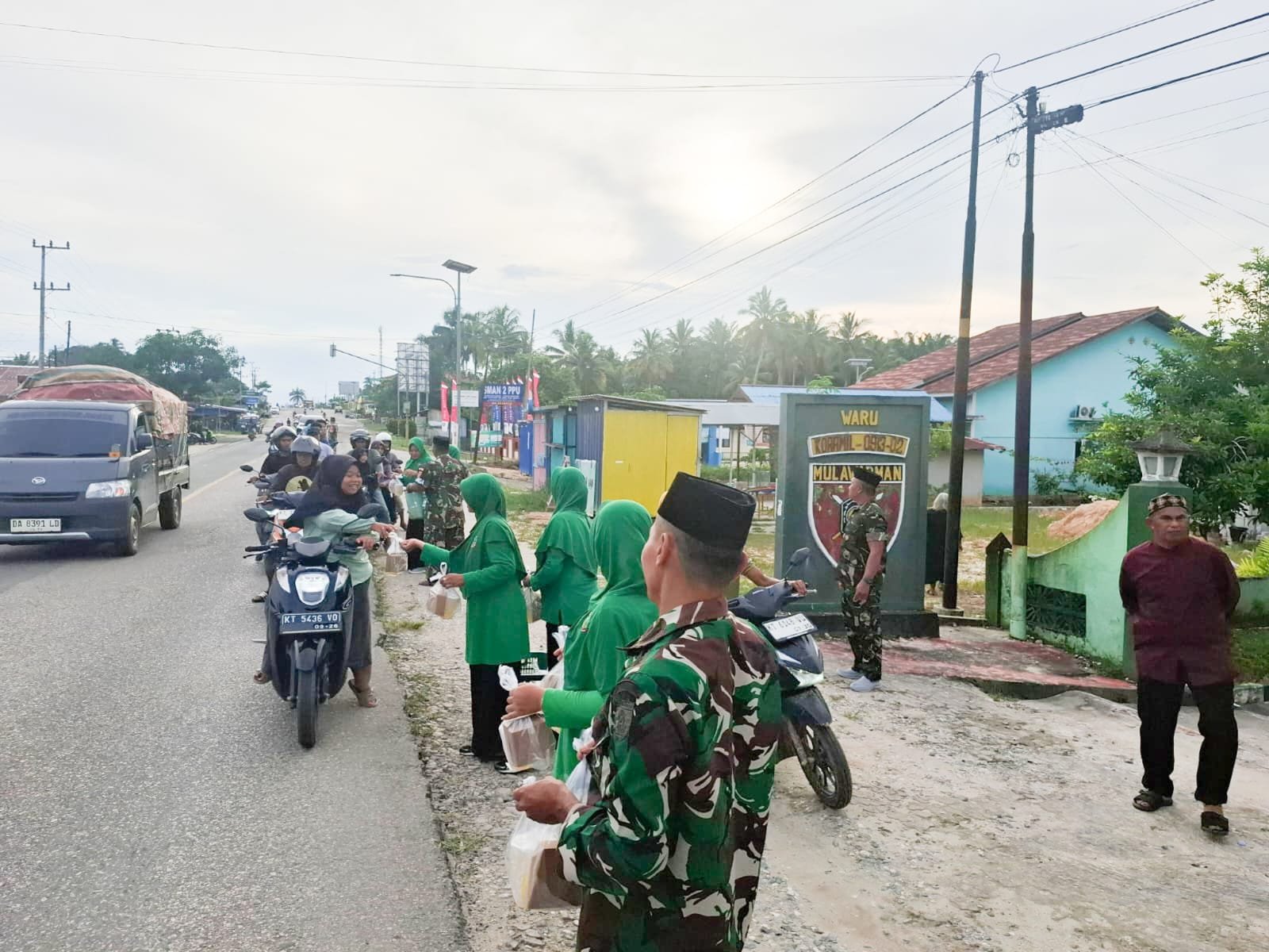 Personel Koramil 02/Waru dan Persit dengan turun langsung ke jalan untuk membagikan paket takjil kepada pengendara maupun warga sekitar yang melintas.