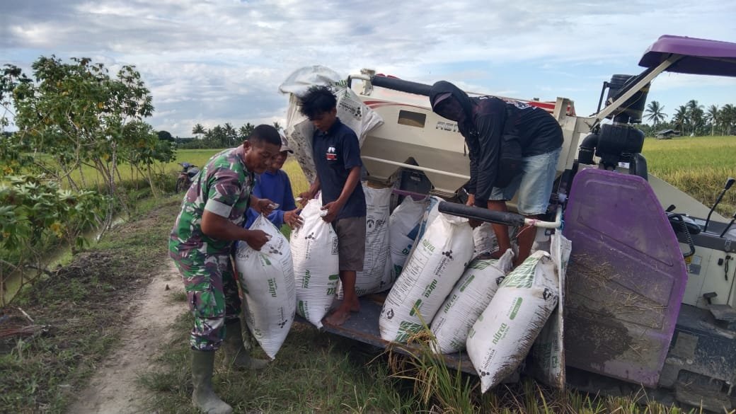 “Sinergitas Babinsa bersama petani setempat dalam panen padi dengan harga jual sesuai dengan ketetapan pemerintah guna meningkatkan kesejahteraan para petani,” kata Serma Sutikno.
